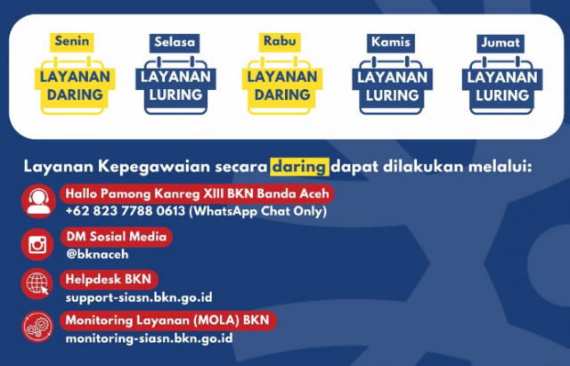 Perubahan signifikan terlihat pada hari Rabu, yang sebelumnya melayani konsultasi tatap muka, kini dialihkan sepenuhnya menjadi Layanan Daring (Online), serupa dengan jadwal di hari Senin. Berikut adalah rincian jadwal terbaru layanan konsultasi Kanreg XIII BKN Banda Aceh: