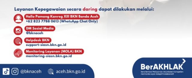 Banda Aceh – Menindaklanjuti penerapan sistem kerja Work From Home (WFH) di lingkungan Badan Kepegawaian Negara, Kantor Regional (Kanreg) XIII BKN Banda Aceh melakukan penyesuaian jadwal layanan konsultasi bagi seluruh pemangku kepentingan dan ASN di wilayah Aceh.